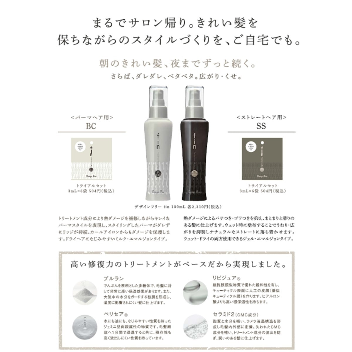 トリートメント成分により、熱ダメージを補修しながらキレイなパーマスタイルを表現し、スタイリングしたパーマがダレずにリッジが持続するアウトバストリートメント。