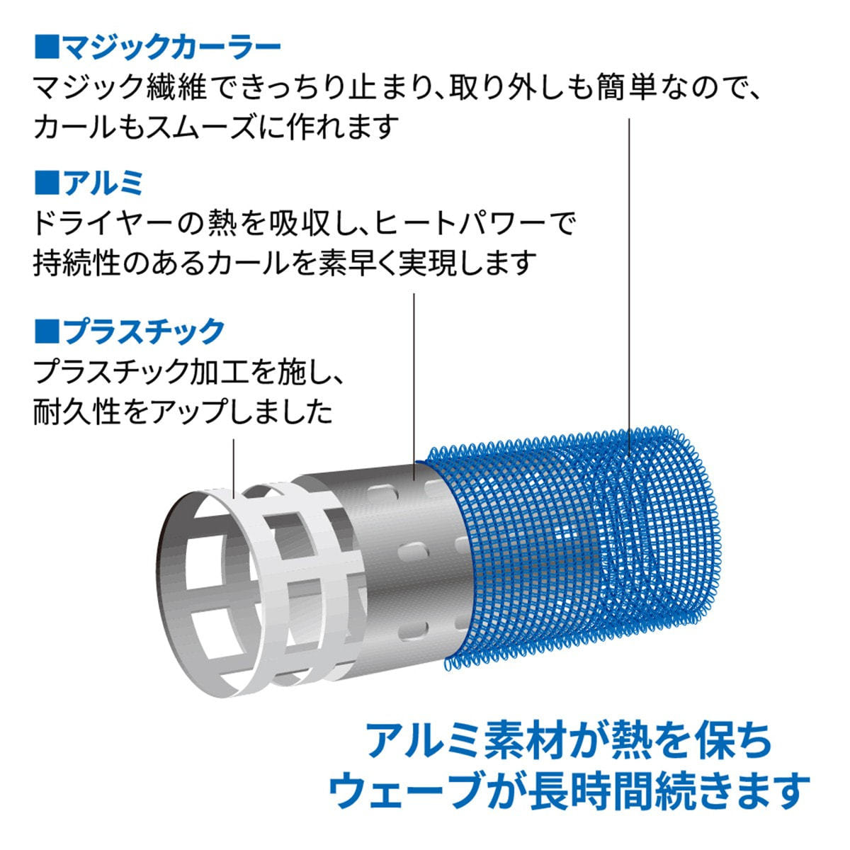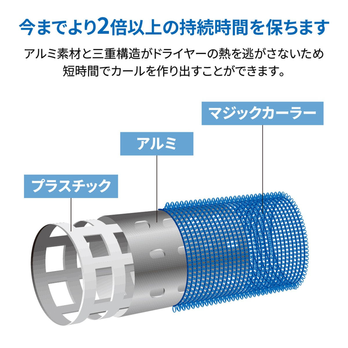 マジックカーラー、プラスチック、アルミ+セラミックコーティングの三重構造でヒートパワーで持続性のあるカールをスムーズに作ることができます。