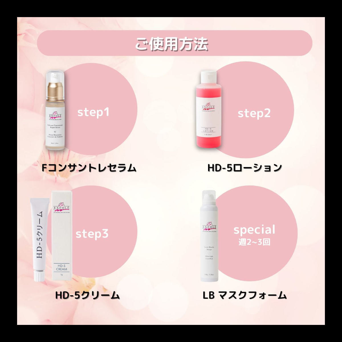 (ローション塗布後、シミの濃い部分にHD-5クリームのご使用をお勧めします。)