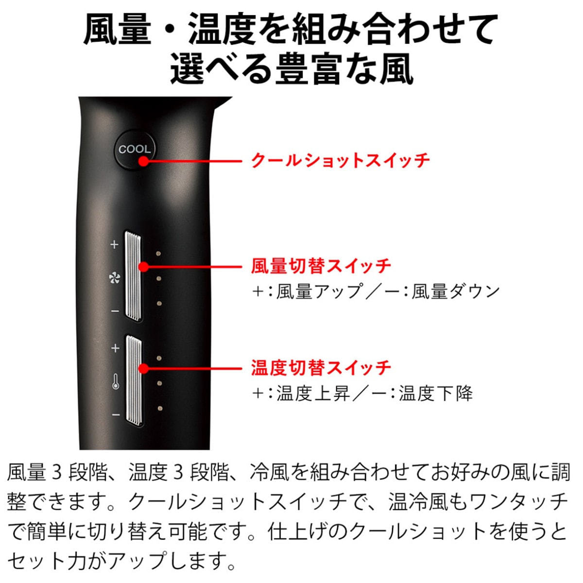 風量3段階、温度3段階、冷風を組み合わせてお好みの風に調整できます。クールショットスイッチで、温冷風もワンタッチで簡単に切り替え可能です。仕上げのクールショットを使うとセット力がアップします。