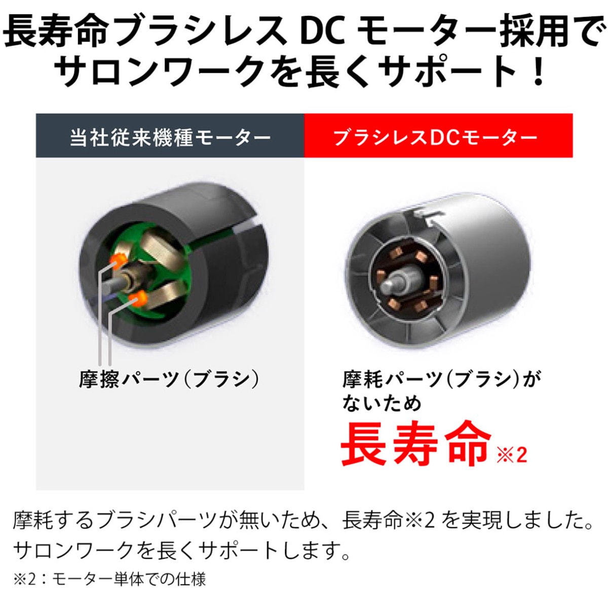 摩耗するブラシパーツが無いため、長寿命※2を実現しました。サロンワークを長くサポートします。 ※2:モーター単体での仕様