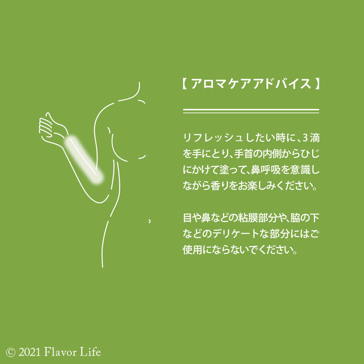 2~3滴を肌に直接塗って、鼻呼吸を意識しながら香りをお楽しみください。