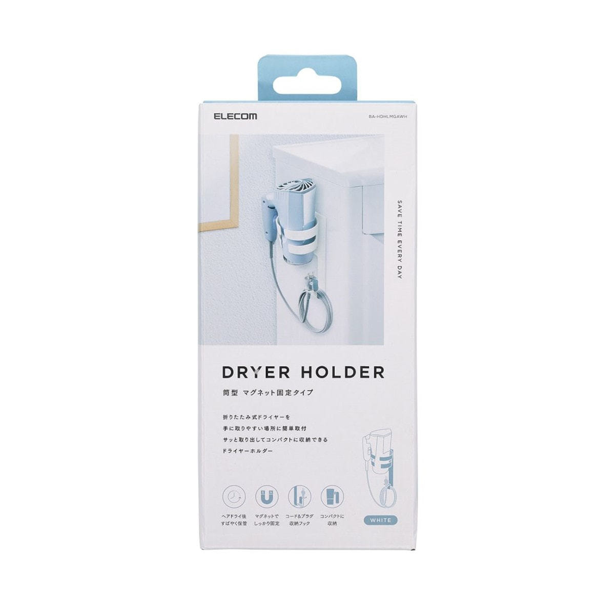 強力なマグネットでスチール面に取り付けられる筒型のドライヤーホルダーです。