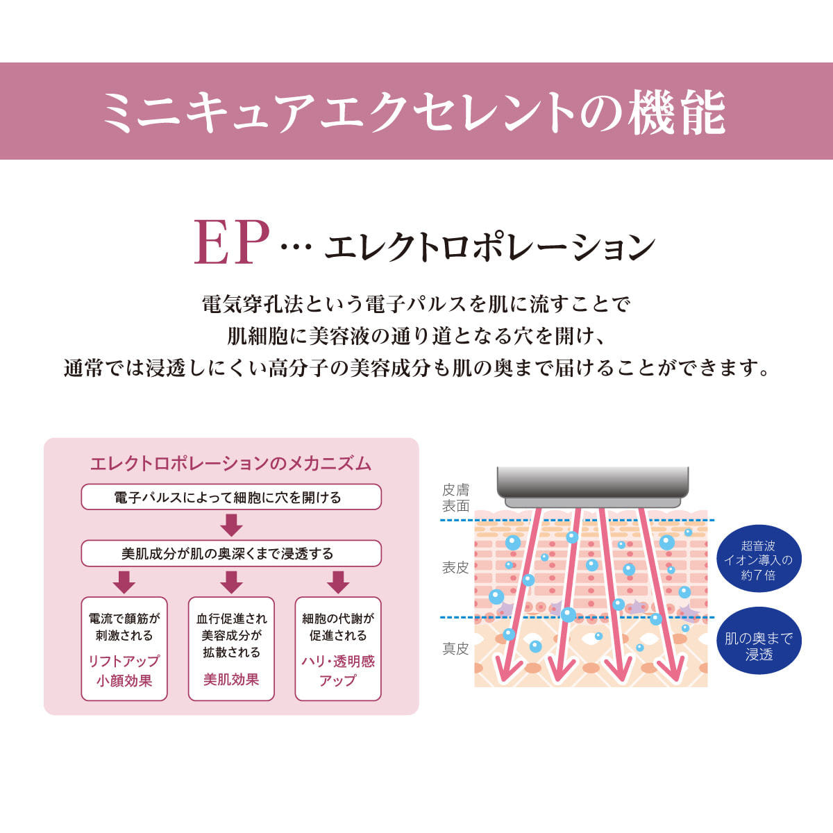 また、エレクトロポレーション機能との相乗効果により、美容成分の浸透率を高めます。