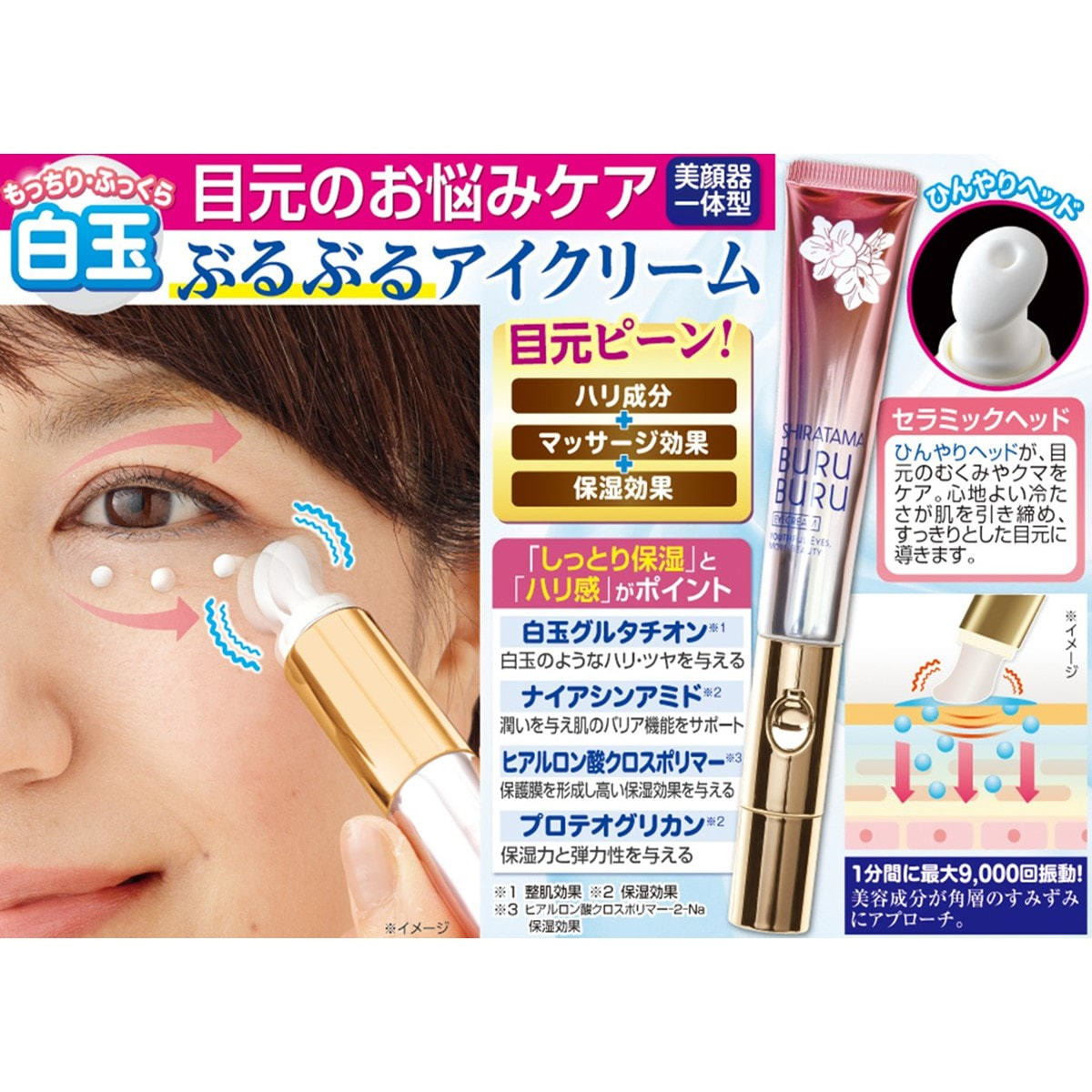 ・「ハリ成分」+「マッサージ効果」+「保湿効果」で目元ピーン!