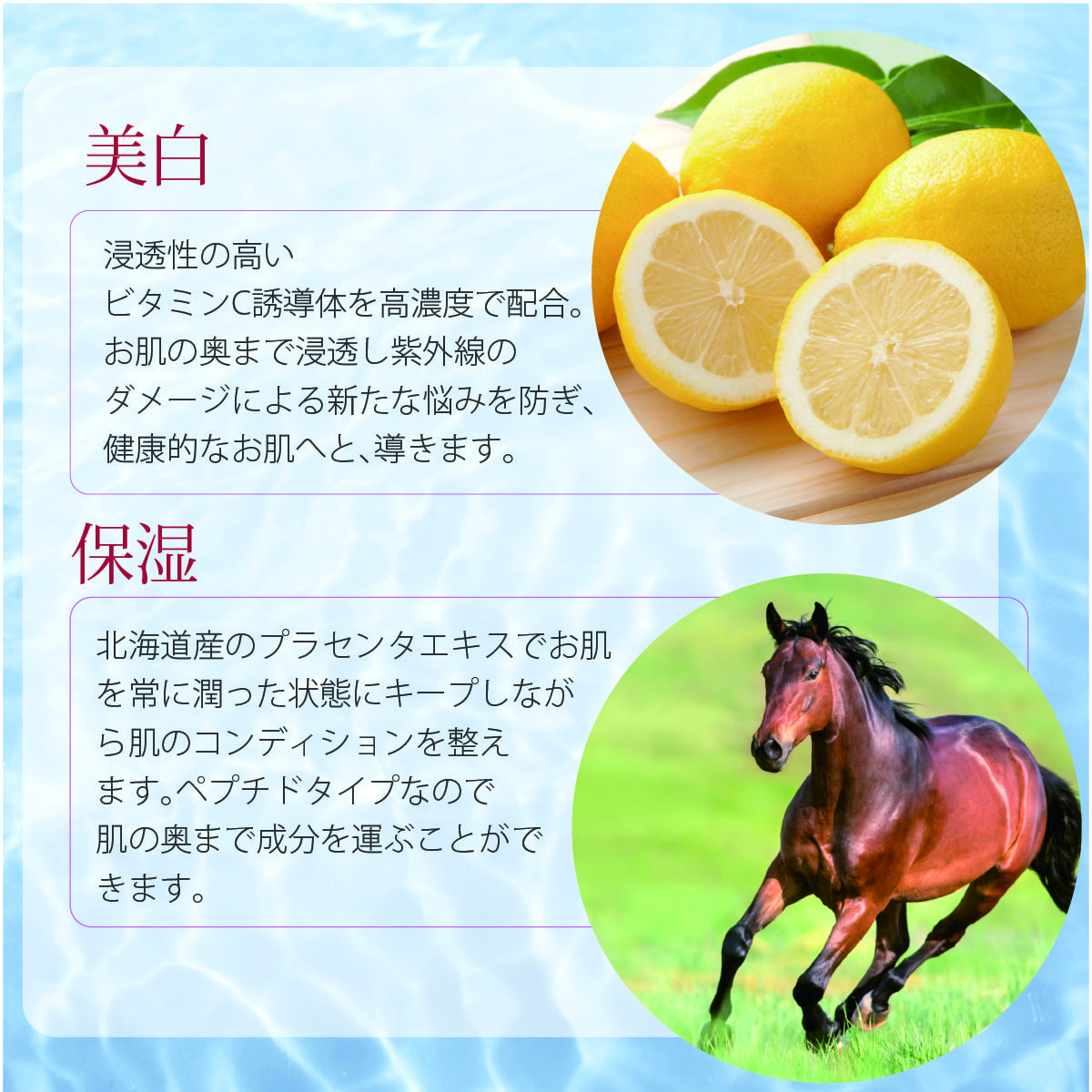 水、リン酸アスコルビルMg、BG、1,2-ヘキサンジオール、プラセンタエキス、乳酸、クエン酸、水酸化Na、フェノキシエタノール