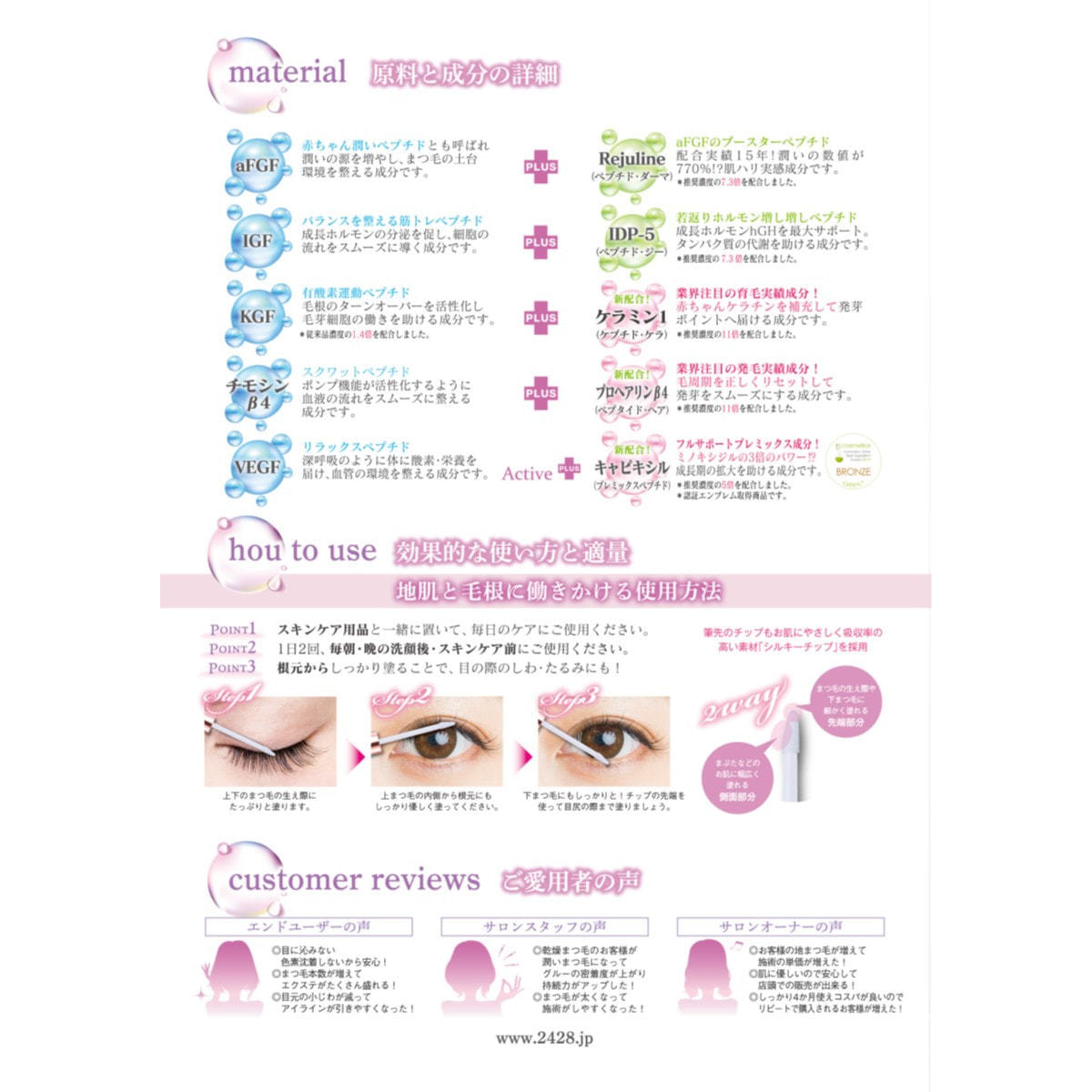 注目の成分まつ毛ケラチンを補充して、発毛ポイントへ届けるお手伝いをする機能性ペプチド成分です。