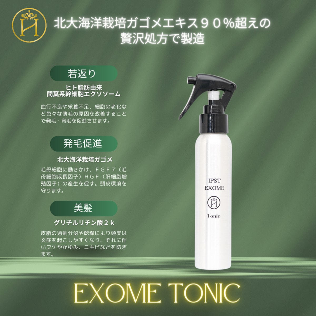 フコイダンを豊富に含むガゴメエキスは、頭皮と髪に有用な成分として古来より重宝され、エクソソームとの相乗効果で健やかな頭皮と美髪へ導きます。