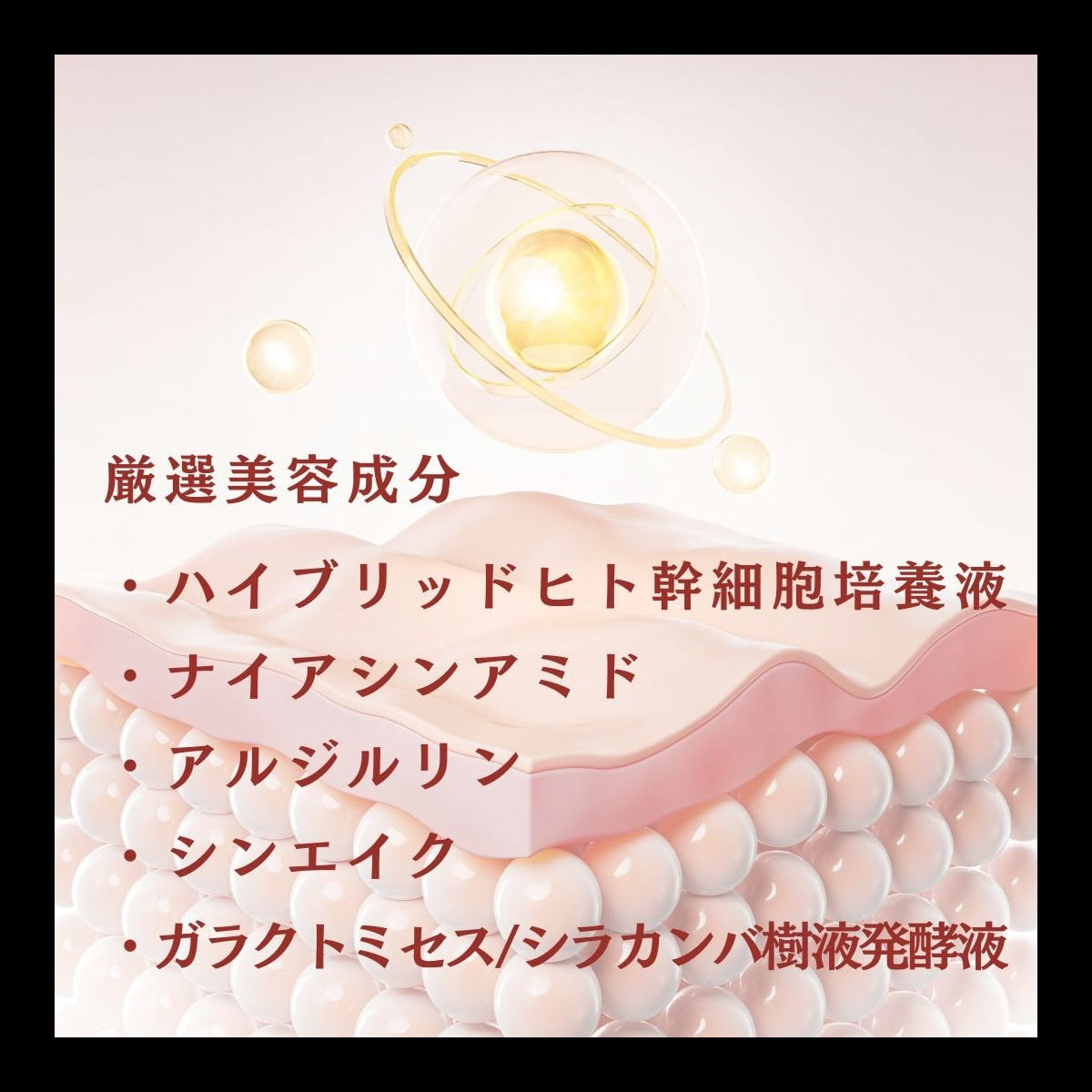 水、グリセリン、BG、ステアリン酸、パルミチン酸イソプロピル、セタノール、トレハロース、シア脂、フェノキシエタノール、TEA、ラウロイルグルタミン酸ジ(フィトステリル/オクチルドデシル)、ベヘニルアルコール、ジメチコン、ステアリン酸ソルビタン、マイカ、酸化チタン、ポリソルベート60、リンゴ果実培養細胞エキス、水溶性コラーゲン、エチルヘキシルグリセリン、アスコルビルグルコシド、キサンタンガム、アルガニアスピノサ核油、ホホバ種子油、ガゴメエキス、ガラクトミセス/シラカンバ樹液発酵液、ダマスクバラ花油、α-アルブチン、アイ葉/茎エキス、ヒト幹細胞順化培養液、レシチン、水酸化Al、1,2-ヘキサンジオール、フェニルエチルレゾルシノール、酸化鉄、水添レシチン、ノイバラ果実エキス、トリ(カプリル酸/カプリン酸)グリセリル、ラウリン酸ポリグリセリル-10、加水分解エラスチン、クズ根エキス、アロエベラ葉エキス、クロレラエキス、ポリソルベート80、ジ酢酸ジペプチドジアミノブチロイルベンジルアミド、カプリリルグリコール、アセチルヘキサペプチド-8、酢酸トコフェロール、シリカ、金、アスコルビルメチルカルボニルペンタペプチド-72-トリ-t-ブチルトリプトファナミド