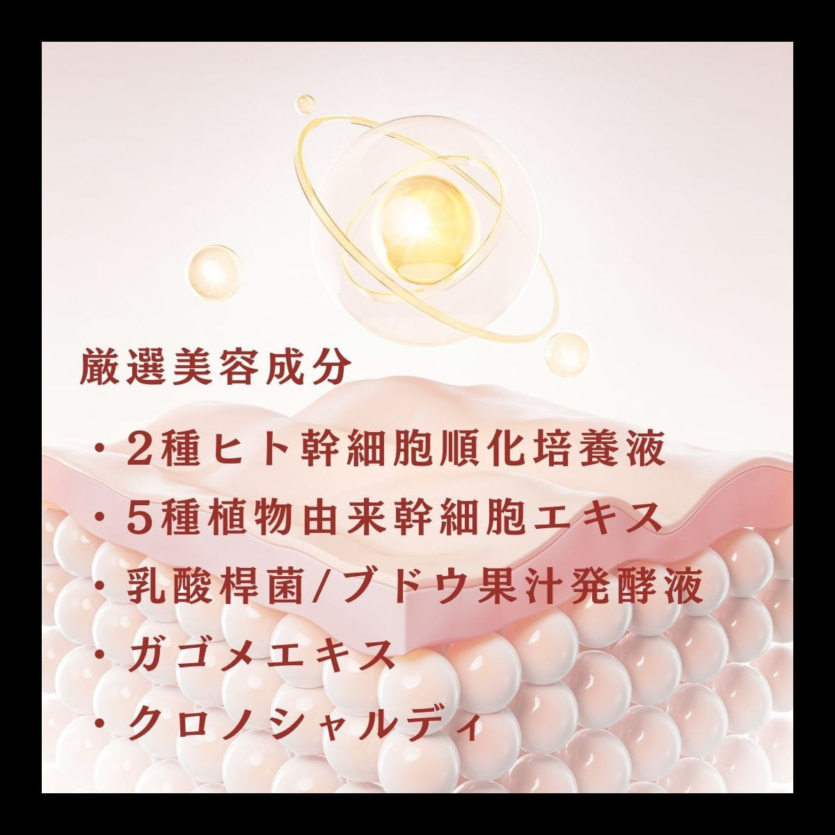脂肪由来と臍帯血由来の2種ヒト幹細胞培養液と5種の植物由来の幹細胞エキスをブレンドすることで、ターンオーバーを促進させ、エイジングケアも同時に行います。
