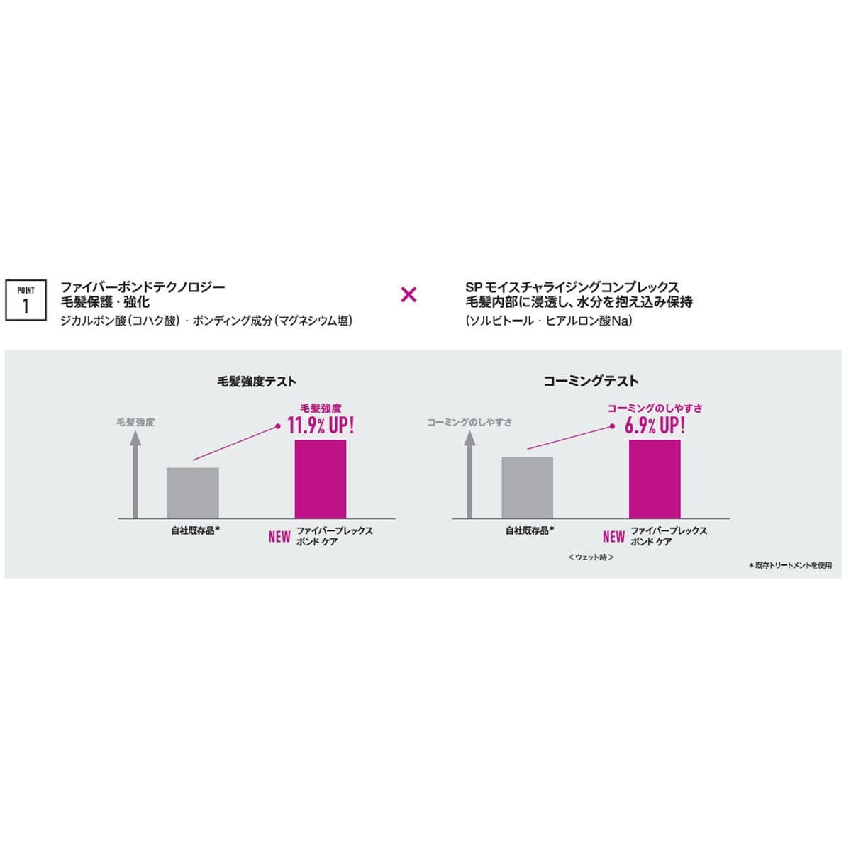 ➂SPモイスチャライジングコンプレックス※3:毛髪内部に浸透し、水分を抱え込んで保持します。④ヒートプロテクション※4:ドライヤーやヘアアイロンなど毎日のルーティーンの中で髪を保護しながらダメージ補修し、毛髪強度を高め、指通りの良いまとまりの良い髪へと導きます。