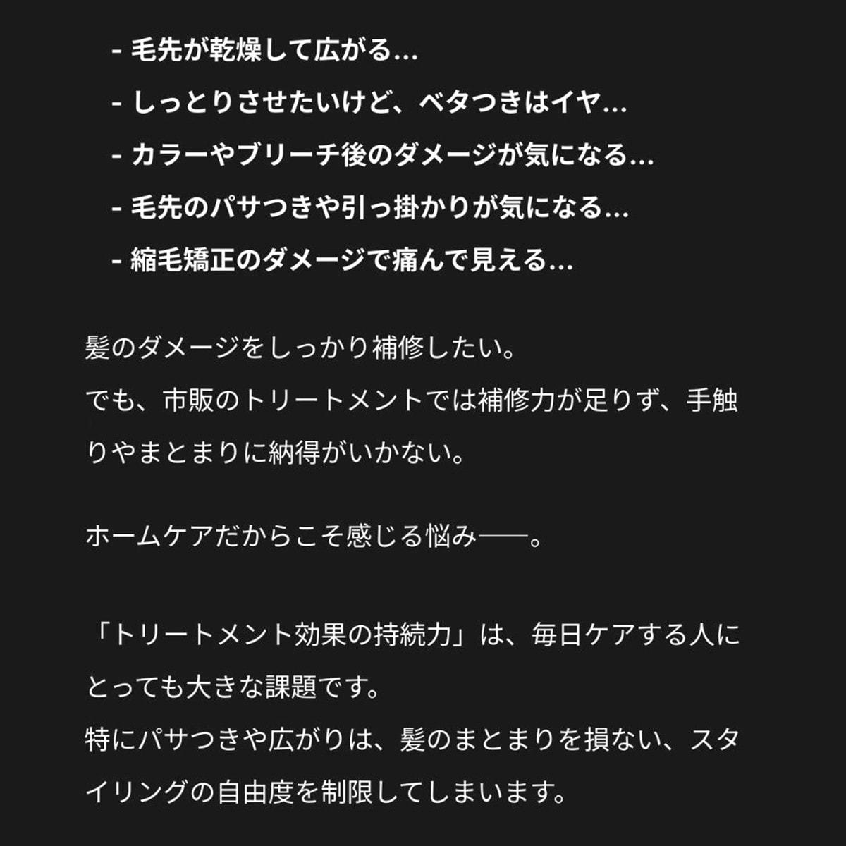 レブリン酸や加水分解ケラチンに加え、最新成分「トステア」を配合し、補修力と持続性をさらに向上。 繰り返しのブリーチやカラーによるダメージも、しなやかでまとまりのある髪へ。