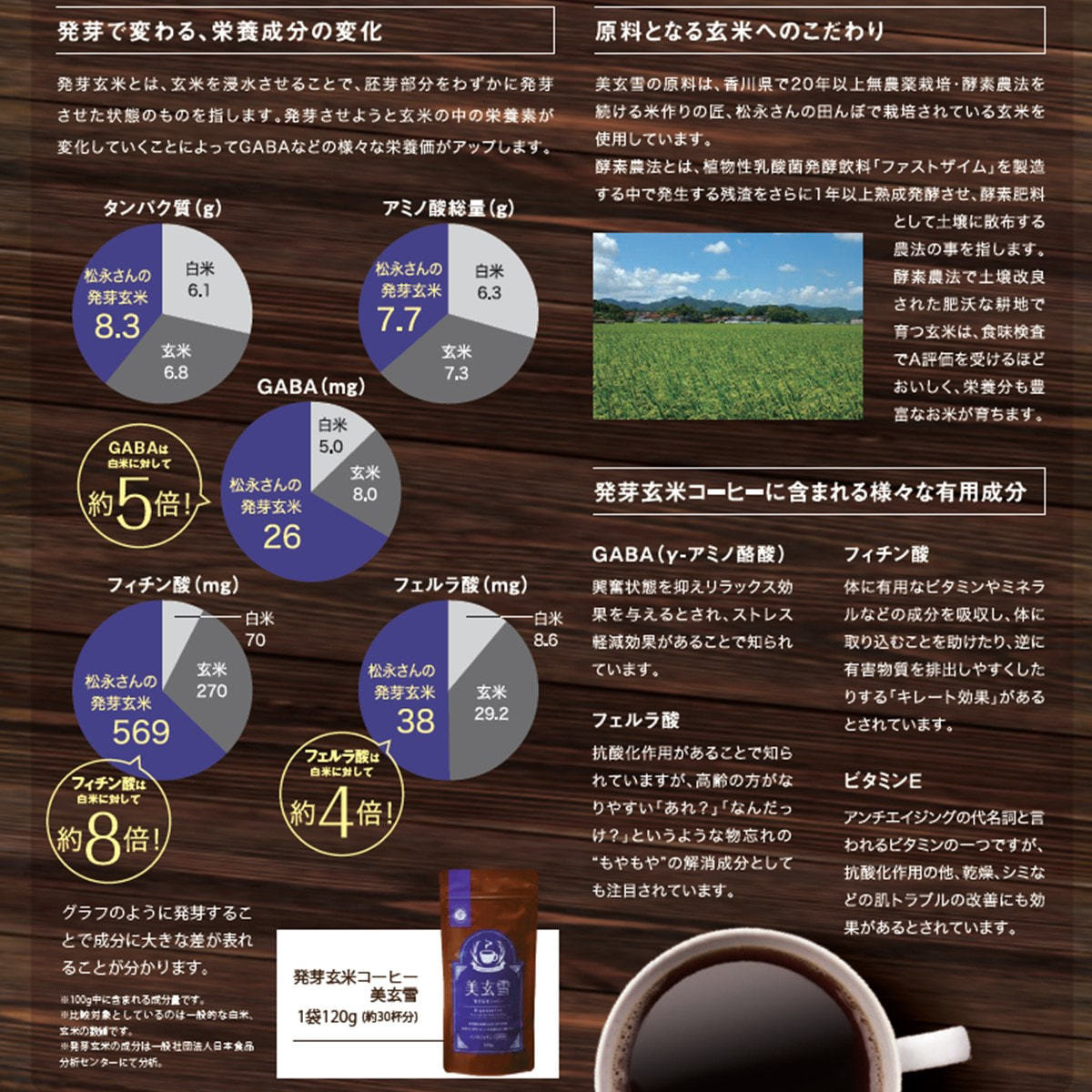 「美玄雪」は米作りの匠が育てた、こだわりの玄米を発芽させた後、焙煎職人が長時間かけてじっくり焙煎する独自製法で仕上げ、栄養価、デトックス作用をアップさせた究極の玄米珈琲です。