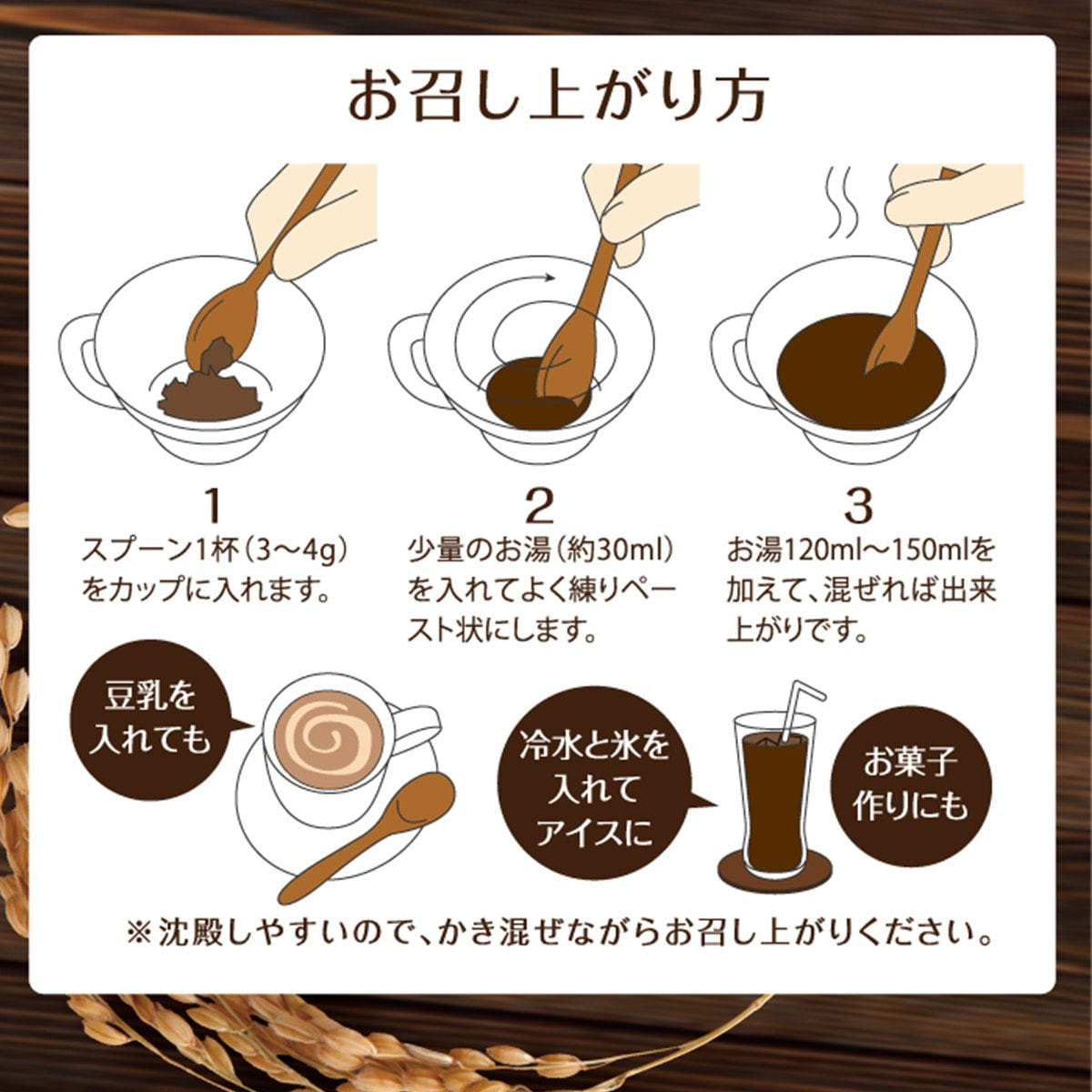 スプーン1杯(3g~4g)を少量のお湯(約30ml)でよく混ぜ、その後さらにお湯120ml~150mlを加えよく混ぜます。※お湯の量は目安になります。お好みで調整してください。