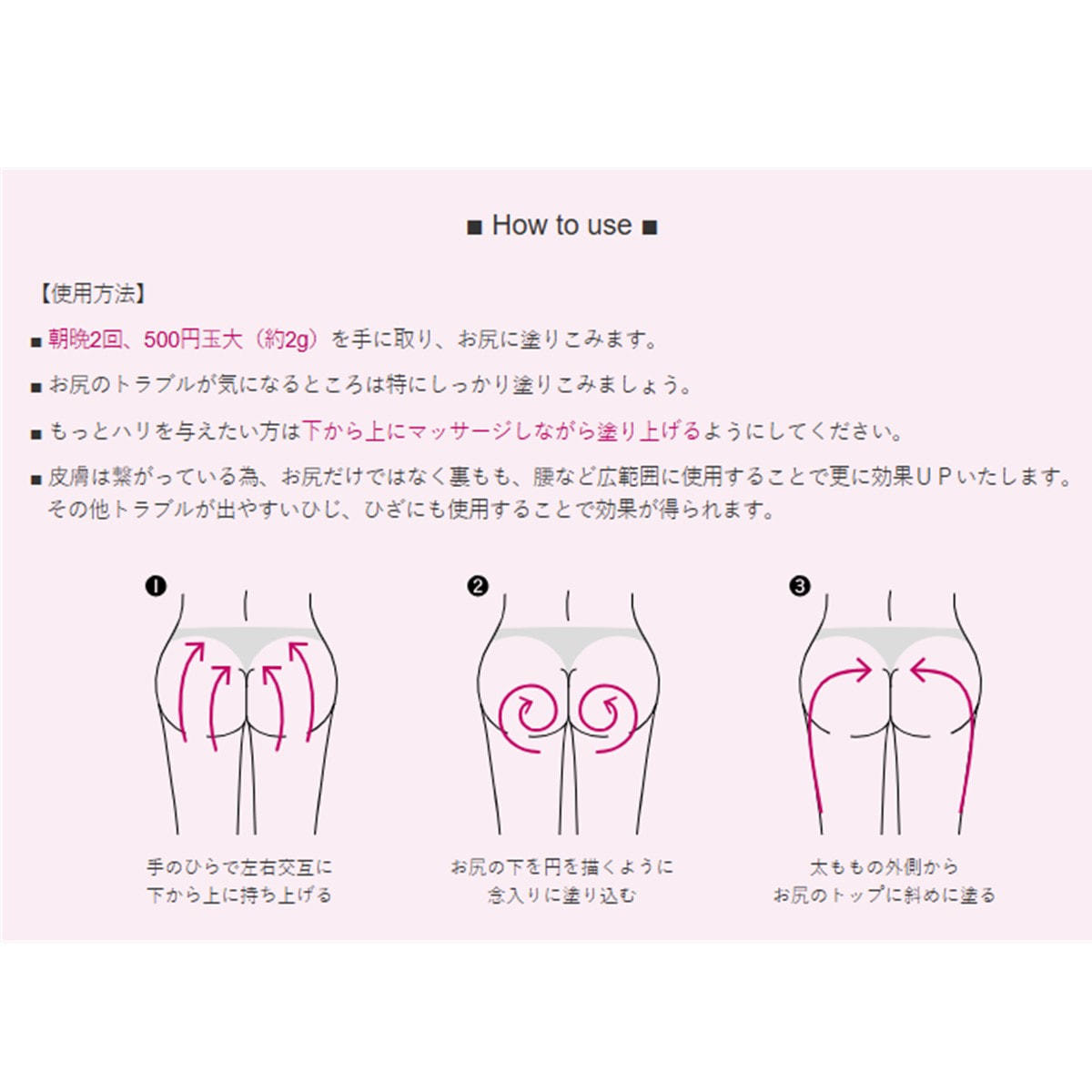 ヒップアップさせたい方は、下から上に、マッサージしながら塗り上げるようにしてください。