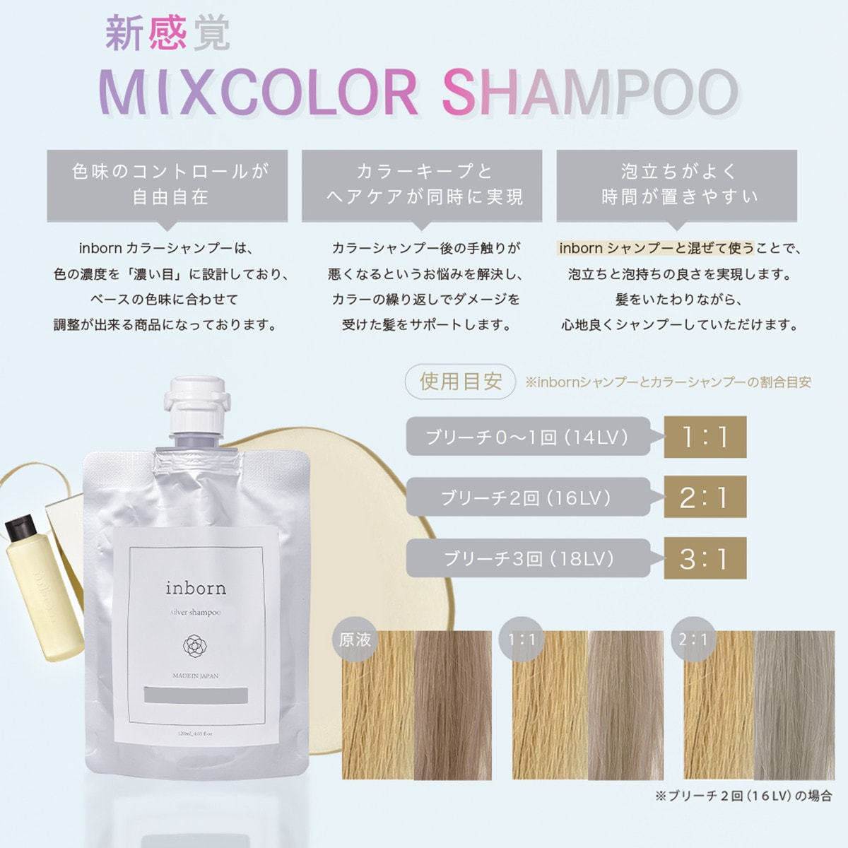 基本的に、「inbornシャンプー:カラーシャンプーを1:1」を目安としておりますが、ブリーチの回数や髪質に合わせて濃度を調整をすることをおすすめしています。
