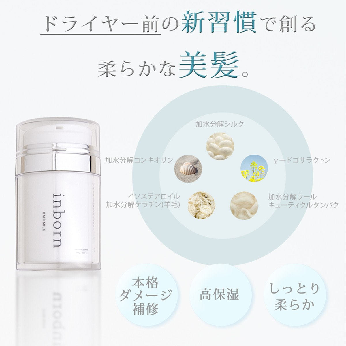 本来、inborn(生まれ持った状態)が髪にとって最高な状態と考え、ハイダメージの髪であっても、本来の健康毛に近づけることをテーマに美容師と共同研究を重ねて作り上げたヘアケアブランドです。